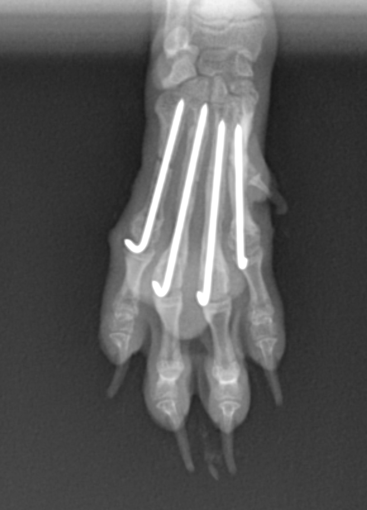 骨折した骨の幅は2.5mmほどでプレートを設置するには骨幅が狭すぎたため、ピンニング法を選