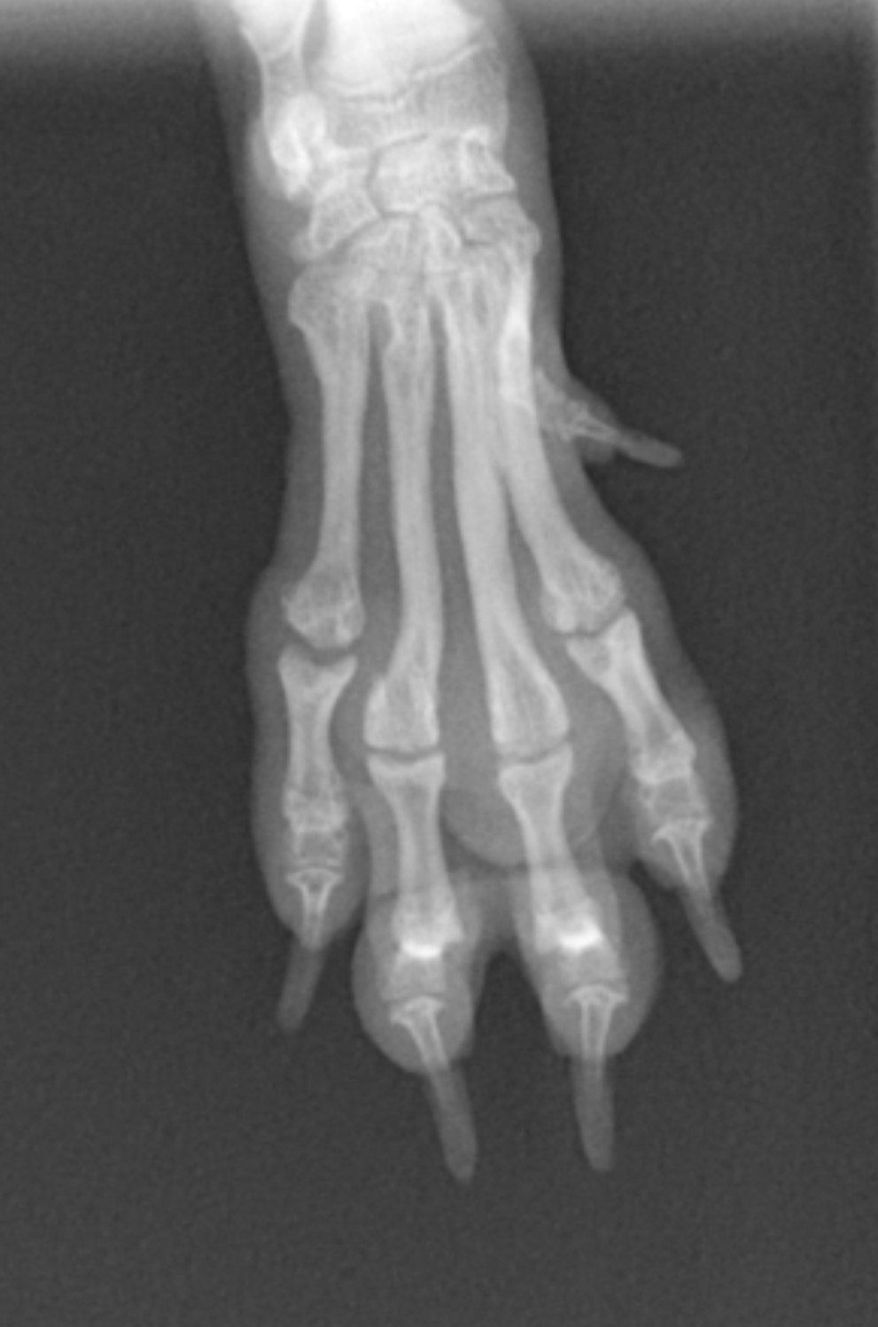 この症例は中手骨骨折で4本折れています。1本のみの場合や場所によっては手術をせず外固定で